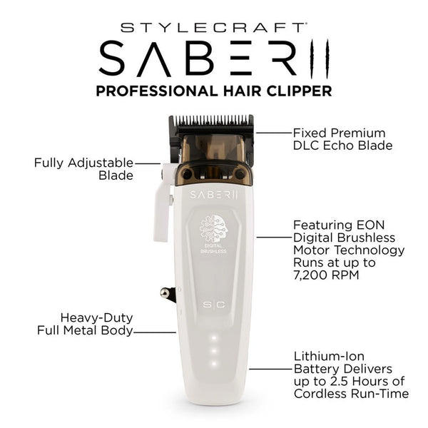 Experience unmatched power, precision, and control with the Saber II Professional Digital Brushless Clipper—engineered for elite barbers and stylists who demand the best. At its core, the Saber II is driven by an advanced EON (Efficient, Optimized, Noise-Reducing) digital brushless motor, delivering up to 7,200 RPM for faster, quieter, and smoother performance. Equipped with a black DLC fixed Echo blade and a Shallow Tooth 2.0 cutter, this high-performance clipper delivers a crisp, audible crunch while gliding effortlessly through hair for a clean, snag-free finish every time.